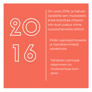 Valitsin sähköisen äidinkielen, koska pidän oppilasjohtoisesta ja itsenäisemmästä opiskelusta. Tehtävien ryhmissä tekeminen on mukavampaa kuin yksin. Sen lisäksi ajattelen että on vuosi 2016, ja haluan opiskella sen mukaisesti, enkä kirjoittaa vihkoon niin kuin joskus viime vuosituhannella tehtiin.